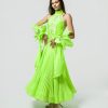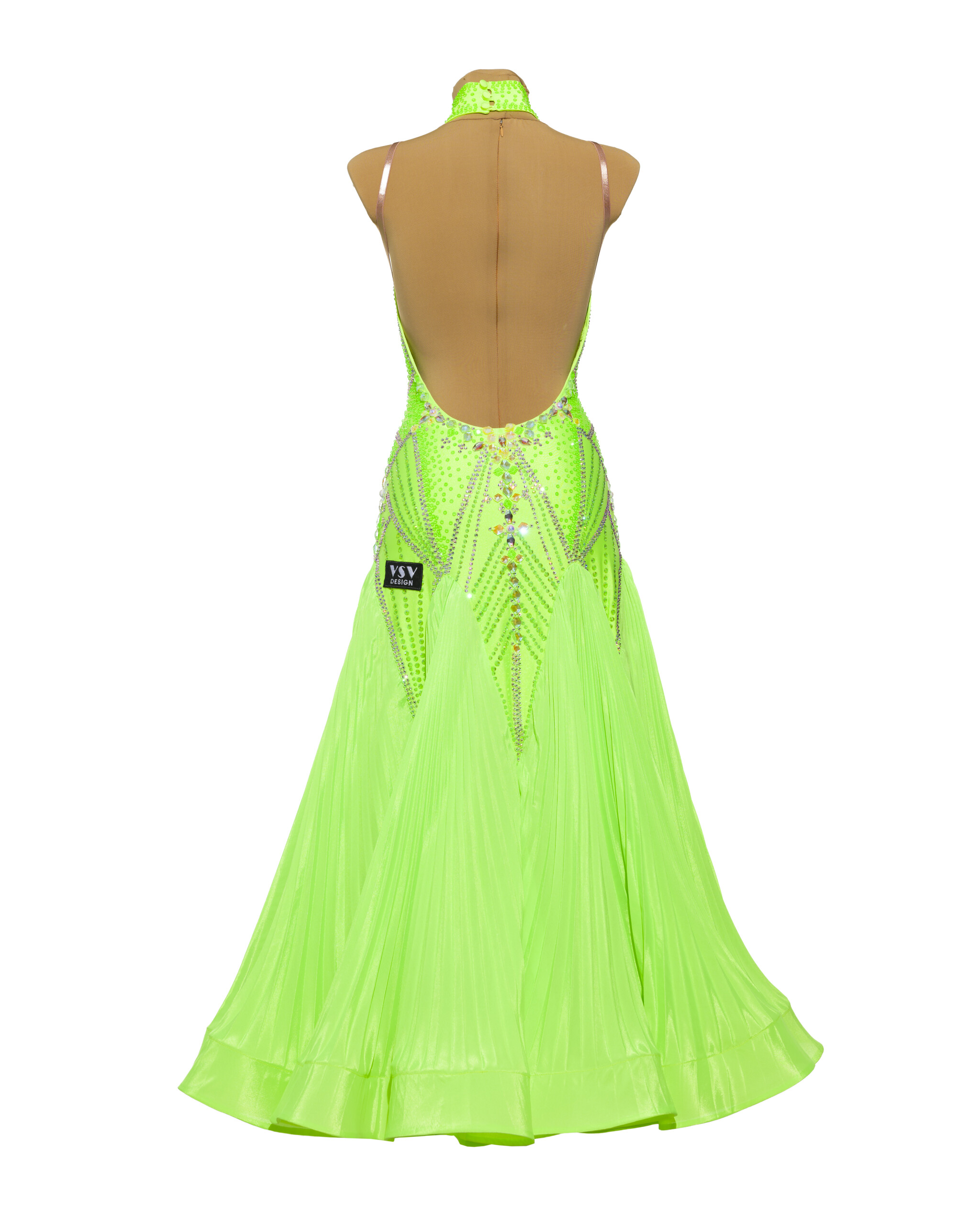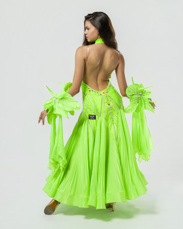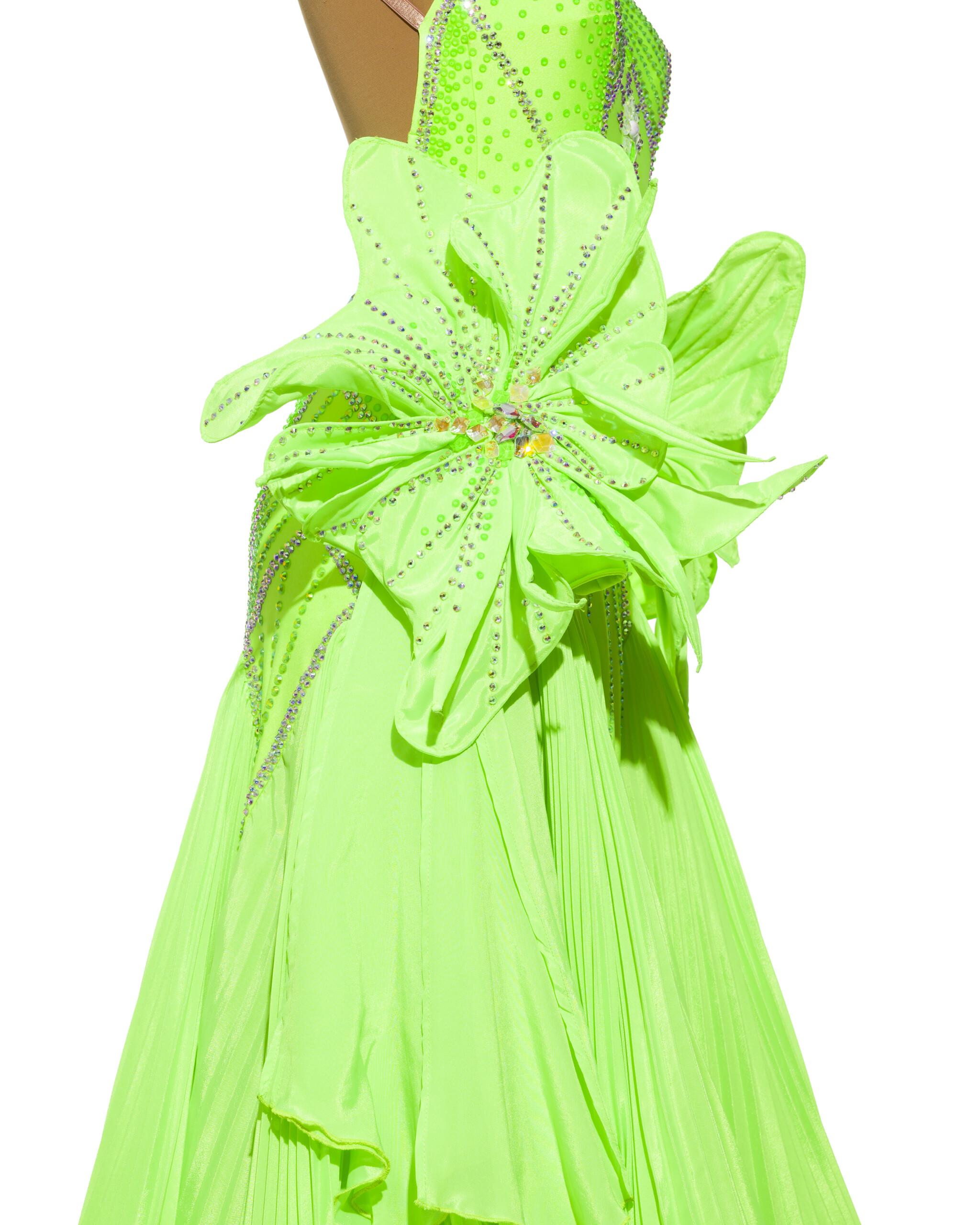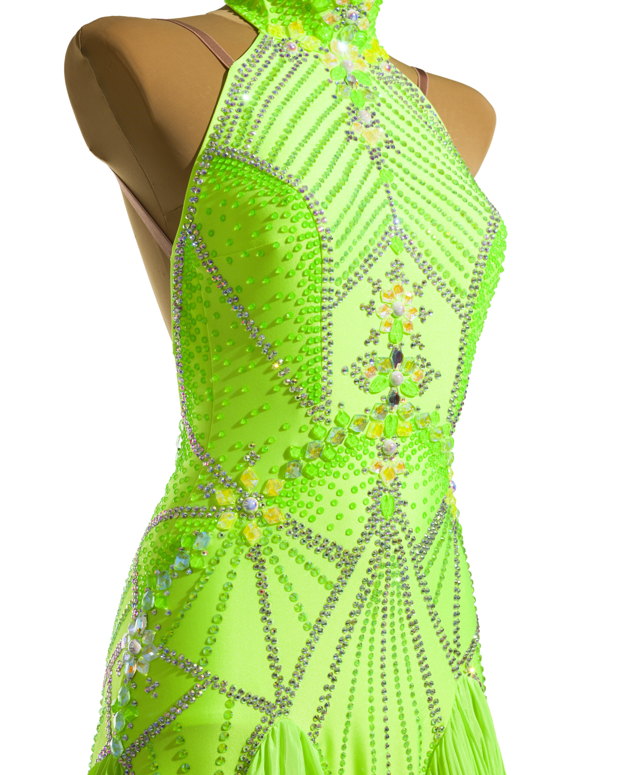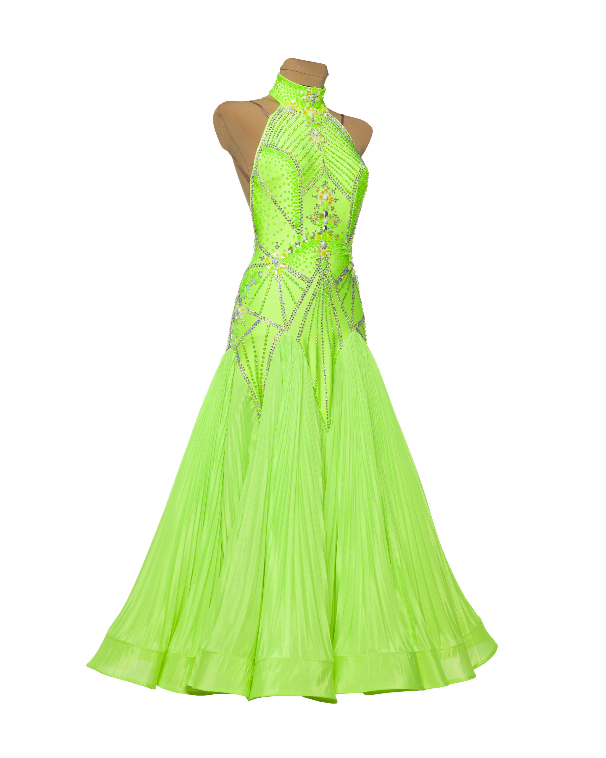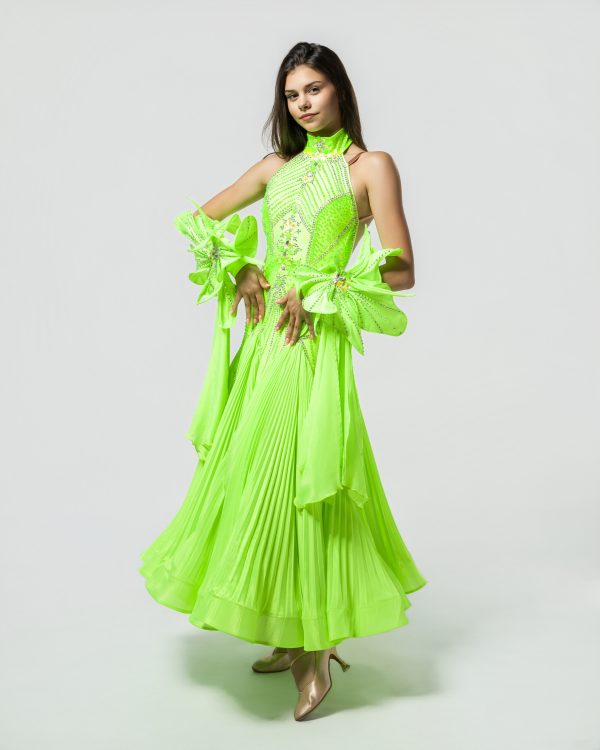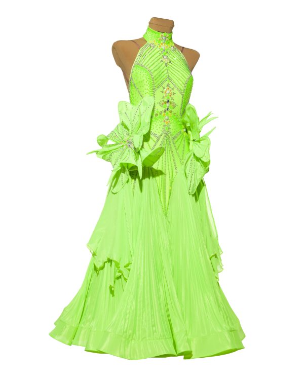 Turn heads on the dance floor with our stunning bright green Standard ballroom dress – a true masterpiece for elite performers. Designed for dancers who crave elegance, distinction, and flawless movement. This gown features radiant crystal arrangements, sculpted floral sleeves, and a silhouette that flatters and elongates with every step.