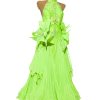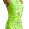 The vibrant green color brings bold energy, while meticulously placed crystals create shimmering patterns that highlight your every move. The neckline gracefully contours the collarbone and neck, adding a refined, professional finish.