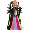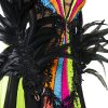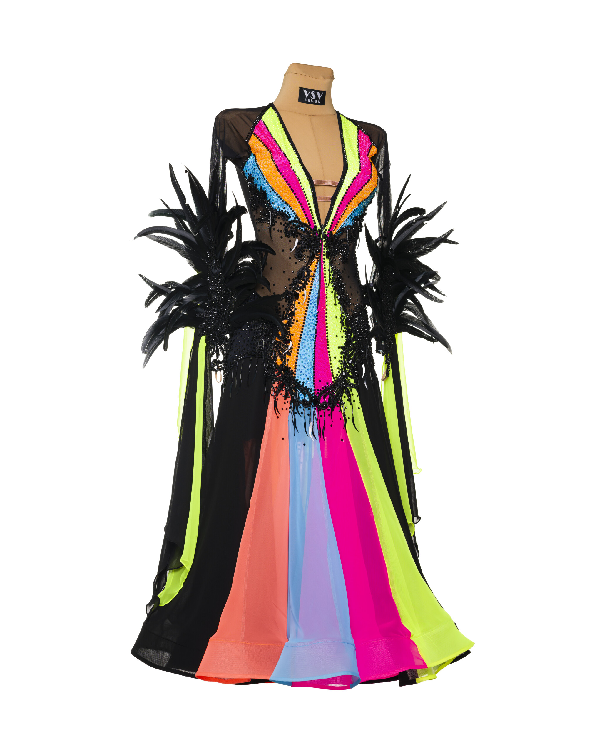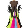 A deep black base meets vibrant, dramatic accents in a design that dares to be different. Every seam is tailored with expert craftsmanship, and the dress is adorned with high-impact crystals and bold color elements that shimmer under the lights. The result? A look that turns heads and leaves a mark!
