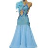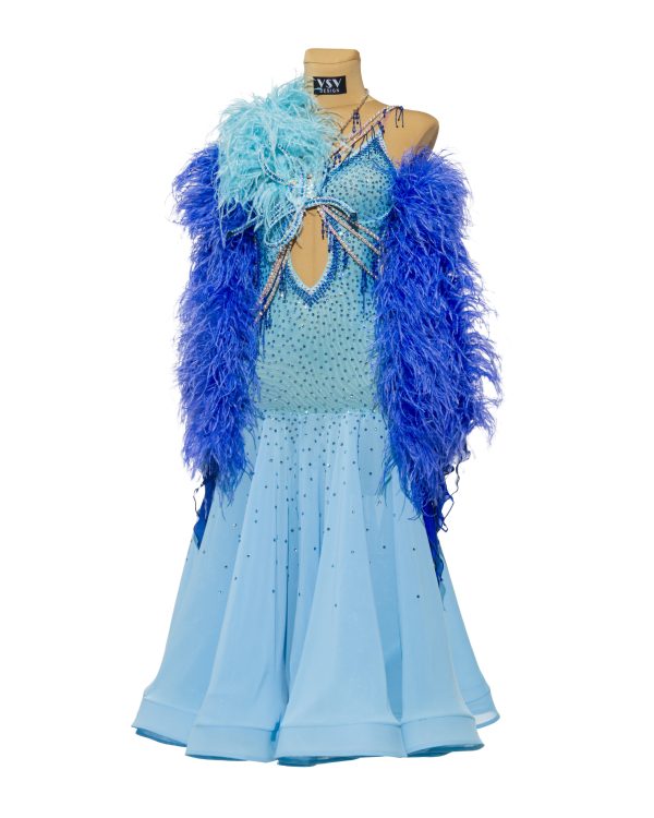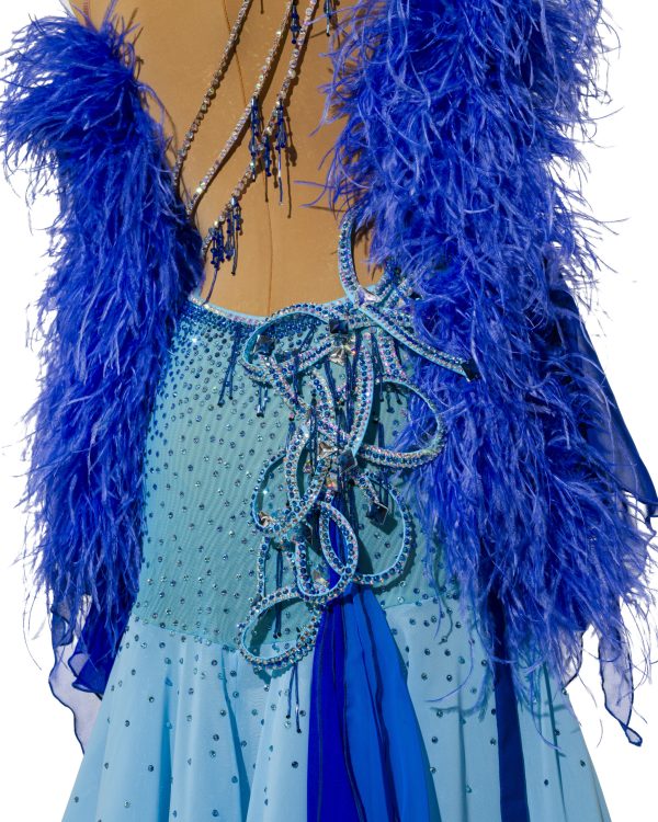 Every element of this gown is crafted to captivate. From the luxurious deep blue tone to the delicate feather accents and sculpted decorative textures, the design radiates sophistication and energy. Shimmering crystals reflect light in motion, making you truly unforgettable on stage.