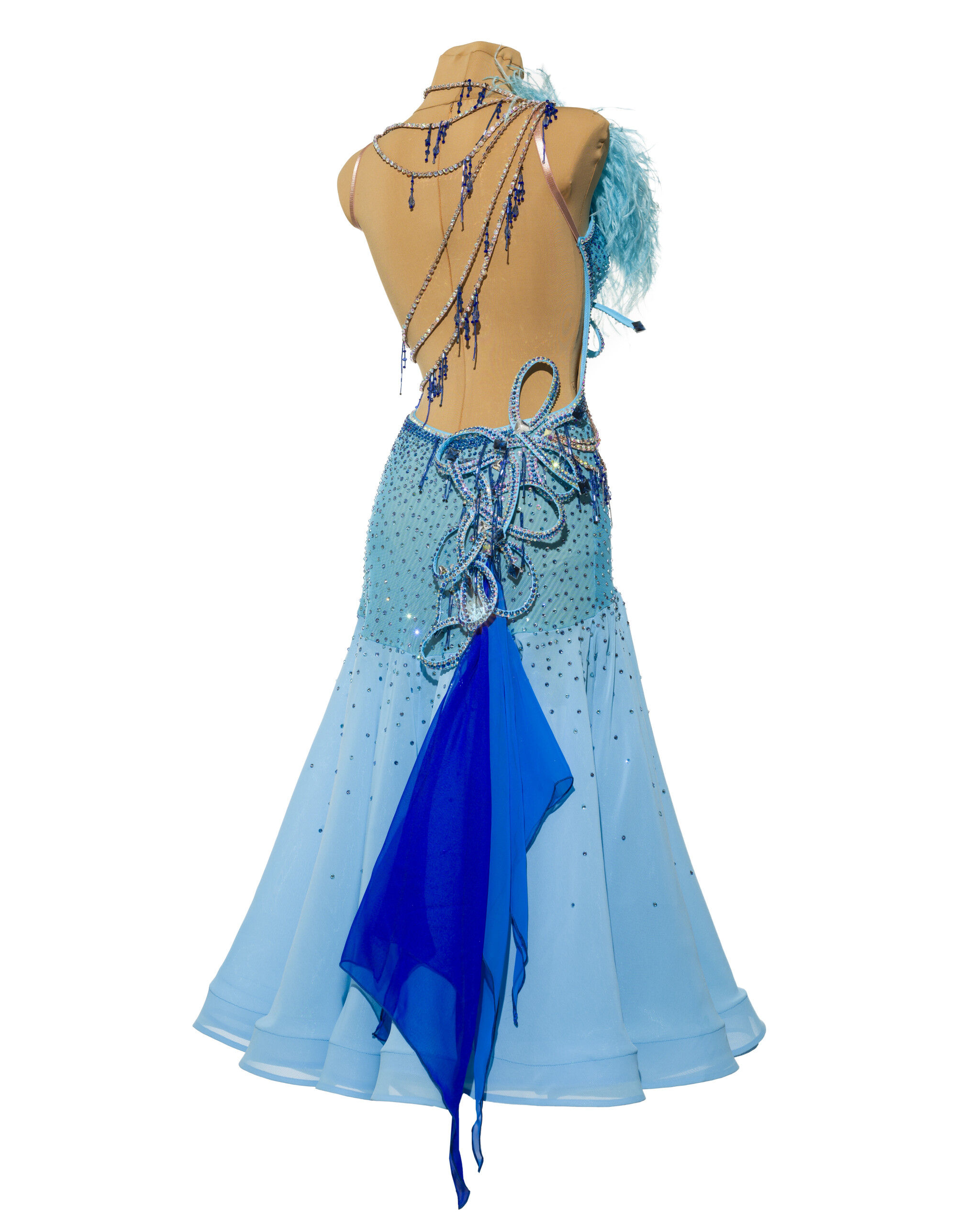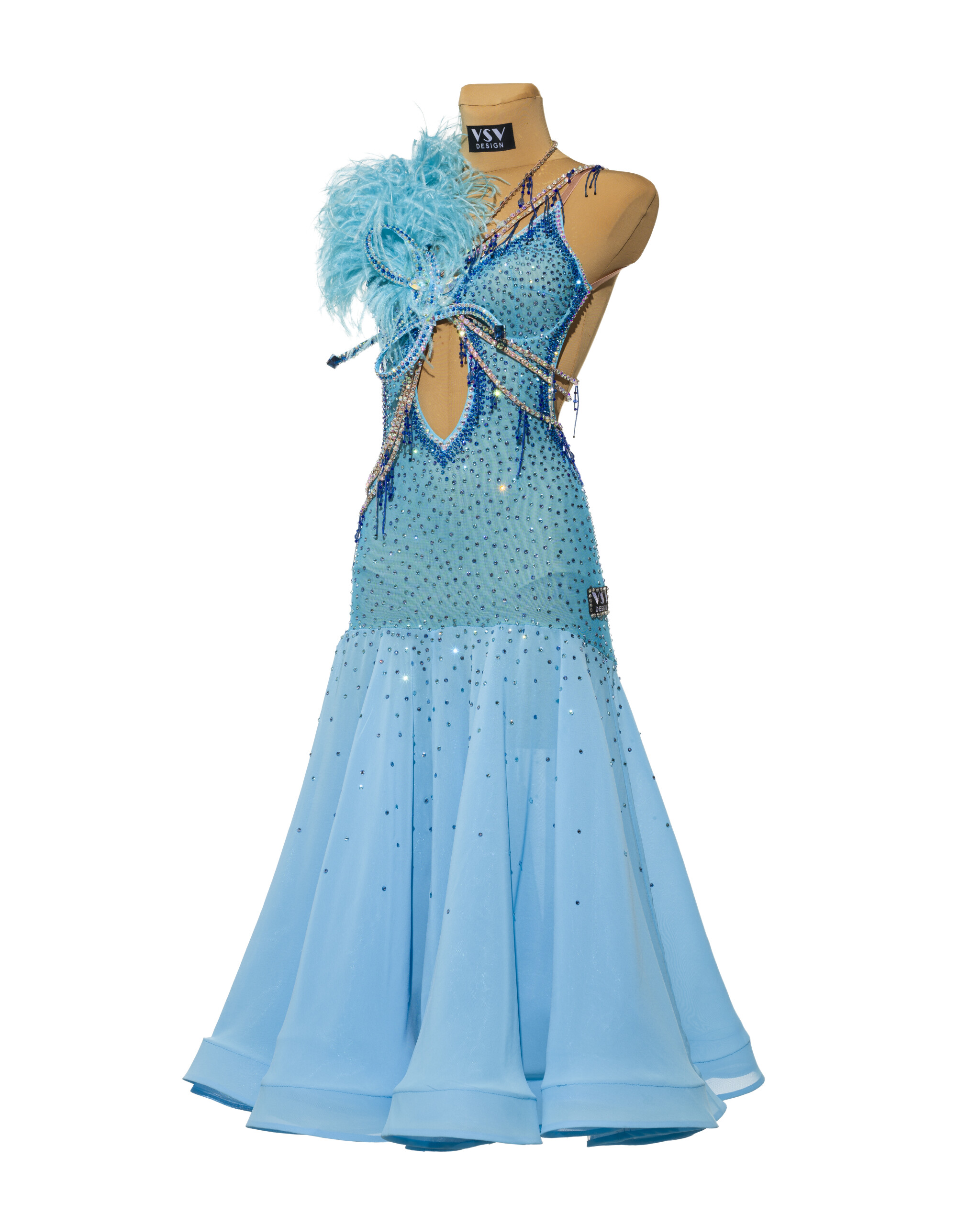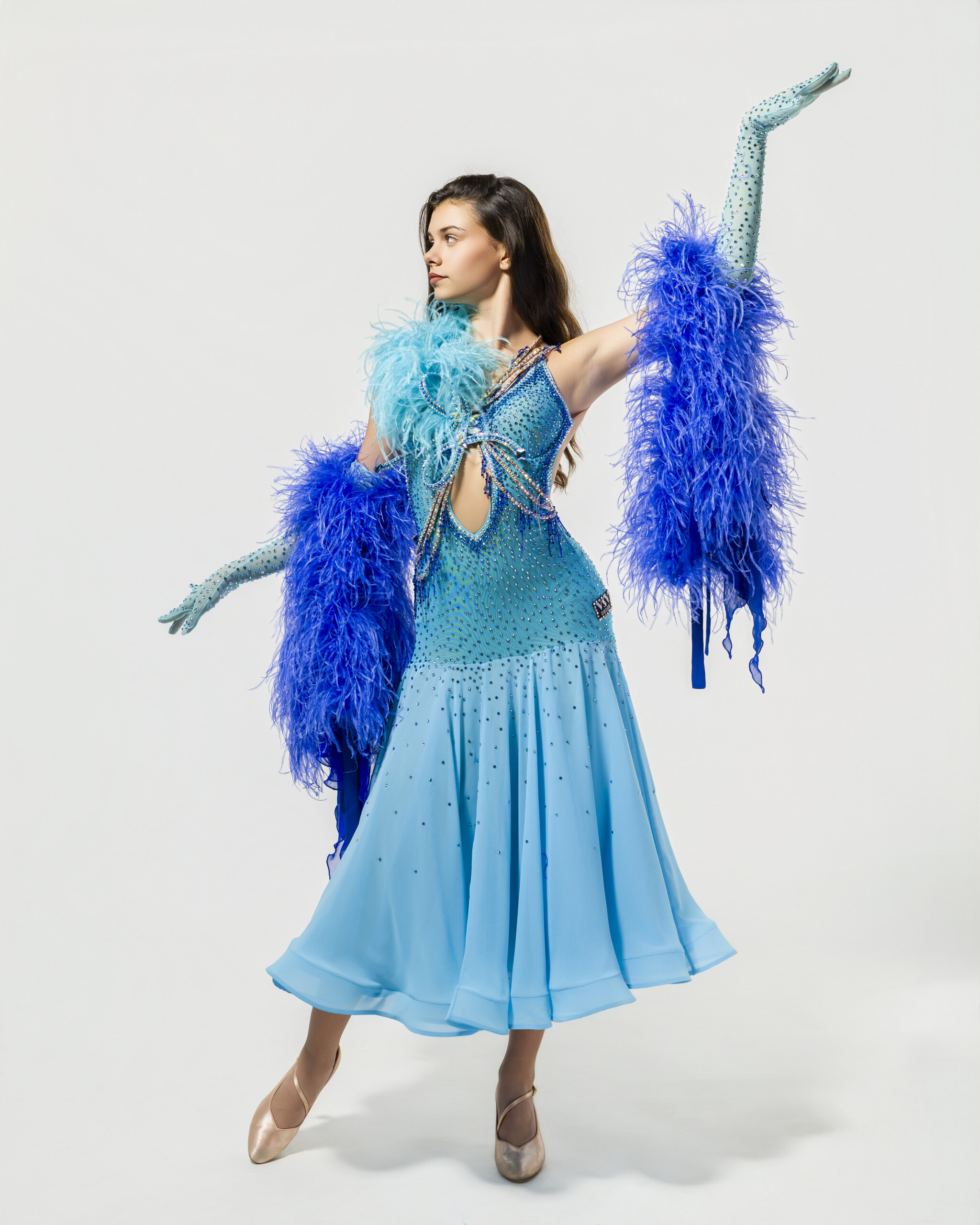Step into the spotlight with our breathtaking premium Ballroom dress in deep turquoise blue , Designed for dancers who demand more – to stand out, feel empowered, and leave a lasting impression.Adorned with intricate 3D embellishments and graceful feathers, this gown is a celebration of bold beauty and timeless artistry.