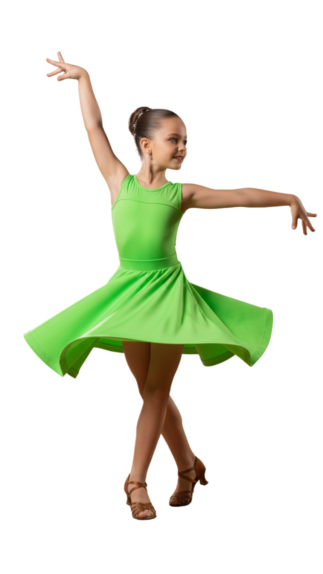 This elegant juvenile dress in green color combines comfort and style to make every little dancer shine on stage! Classic sleeveless dress pattern which give an elegant look on the stage! The dress is made of two pieces for more convenience when undressing and dressing.