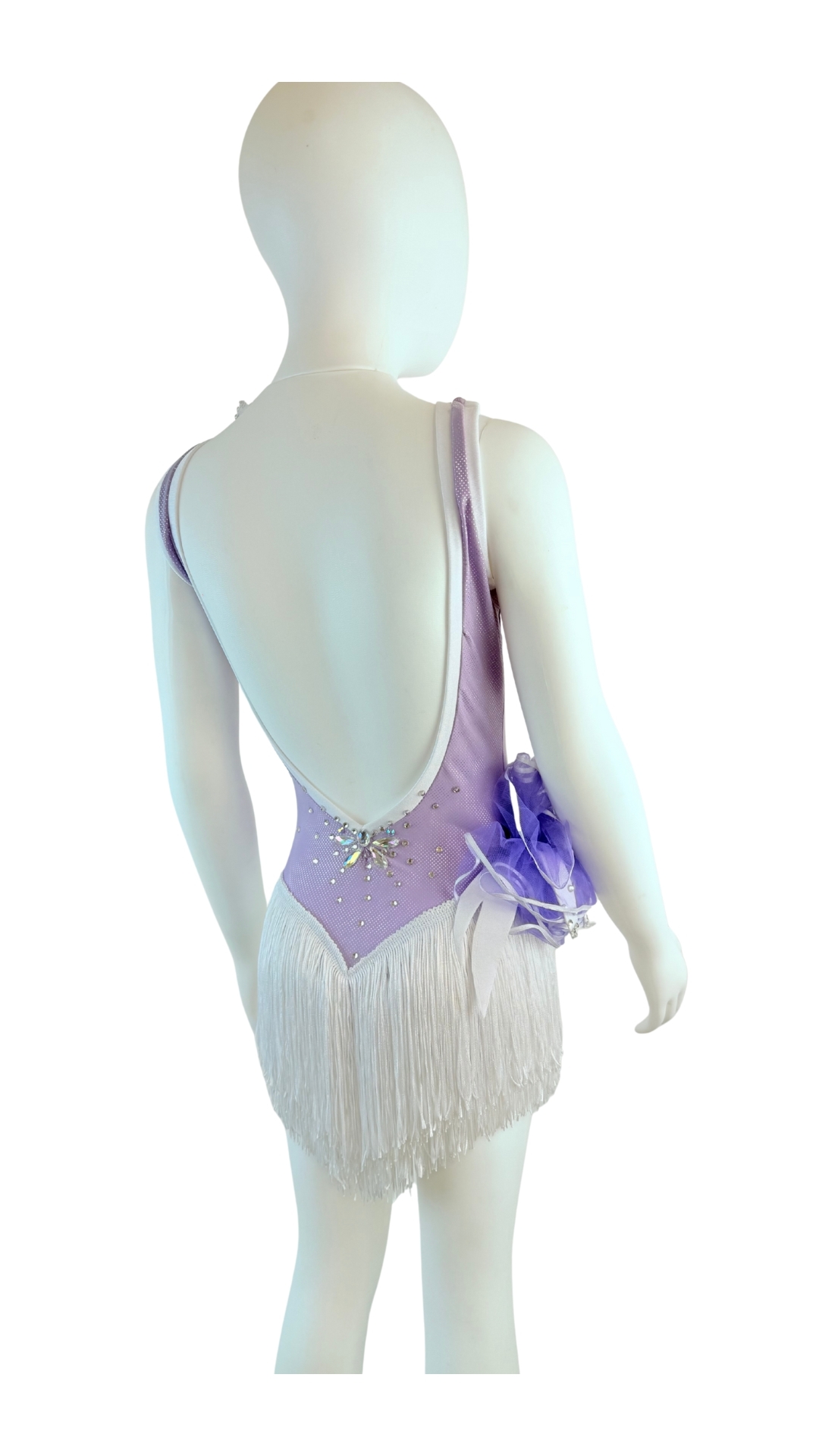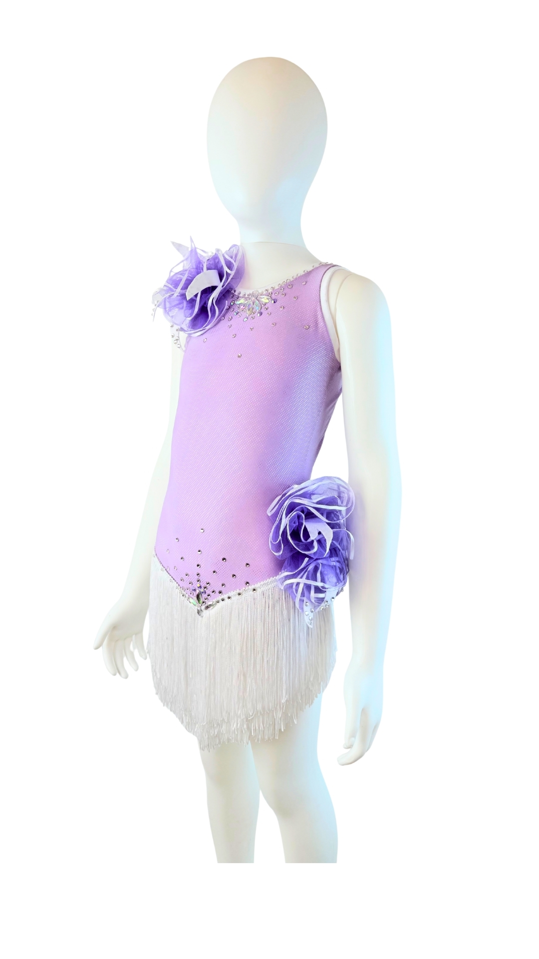 An elegant purple dress for Latin dance, featuring a clean and modern design. The short skirt with white fringe ensures excellent movement and a great effect on the dance floor. The top is decorated with a beautiful 3D flower and stones for extra sparkle. This model is suitable for any competition or performance, providing both style and comfort.