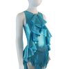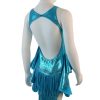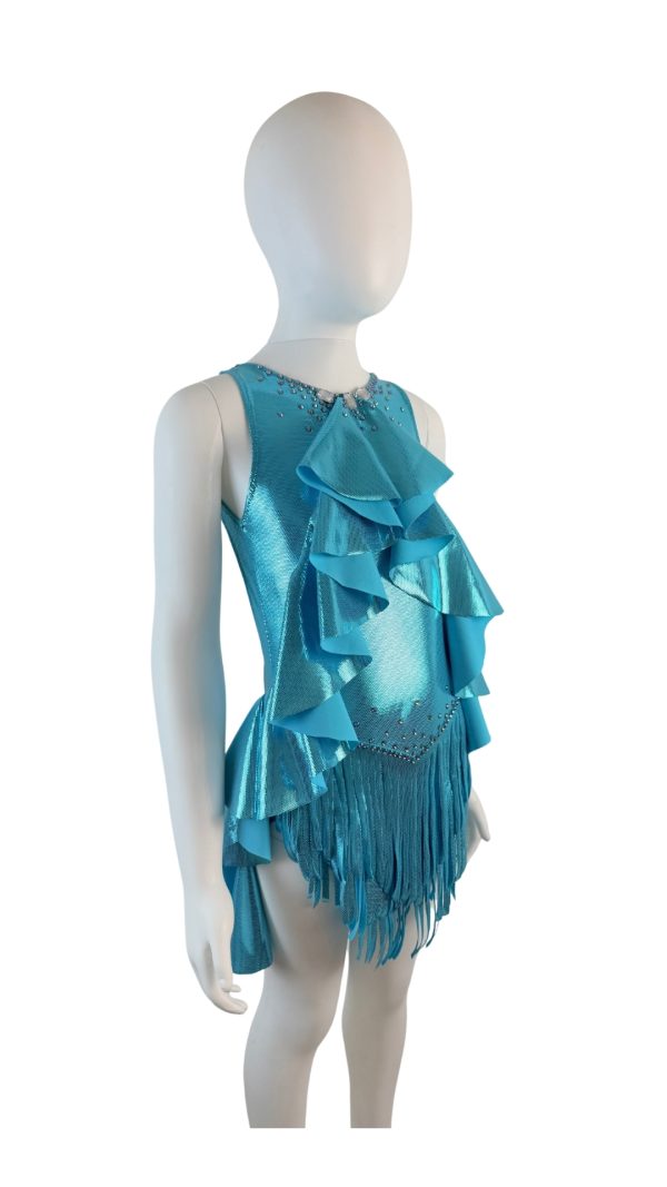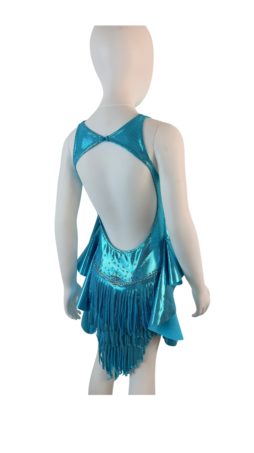 It’s time to shine on the dance floor! This vibrant blue Latin dance dress is designed to capture every eye. Made from a glossy fabric that creates a stunning shimmering effect under stage lights, it’s adorned with a variety of beautiful stones in different sizes for a dazzling accent. The design is highlighted by elegant ruffles and a short skirt of fringe, ensuring unmatched movement and glamour during every performance. With this dress, your little champion will truly become a star.