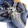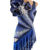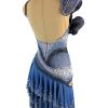 Eccentric and elegant model dress for Latin dance in dark blue color. The embellishment is embossed and in a contrasting white color and multiple hanging glitter elements and rhinestones.