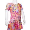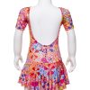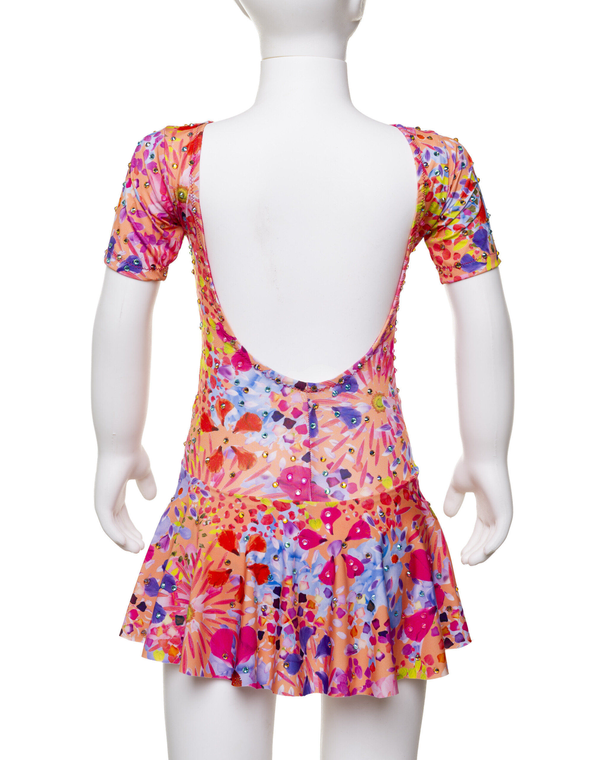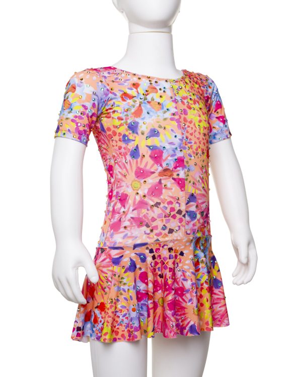 Gymnastics leotard in floral print with embellishment. Classic pattern with short sleeves and a short skirt-type top layer.